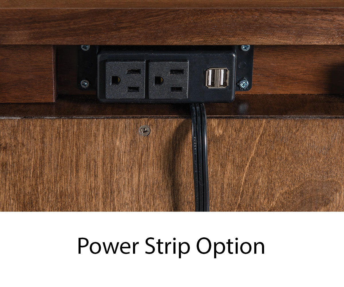 • Lockable sliding top to show a security tray; also includes power strip